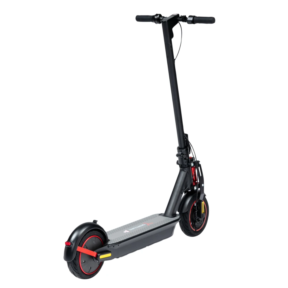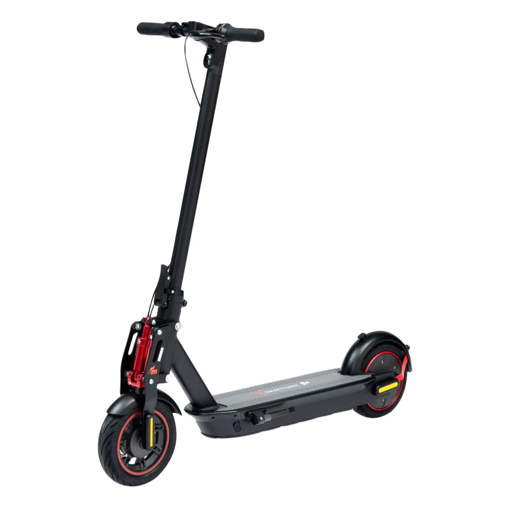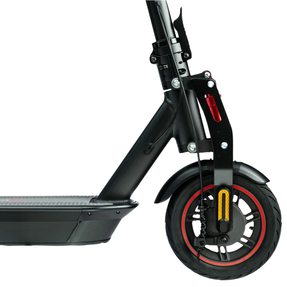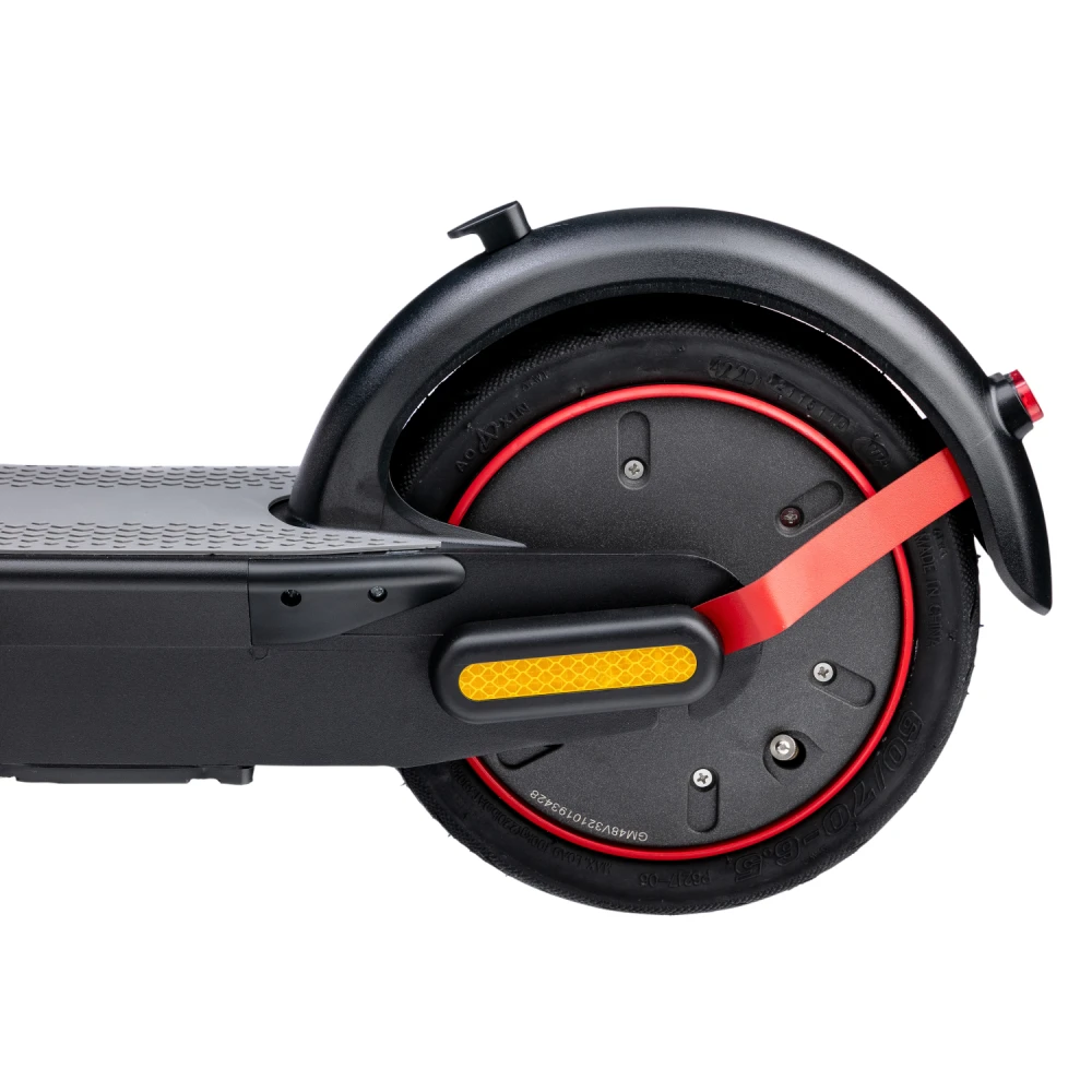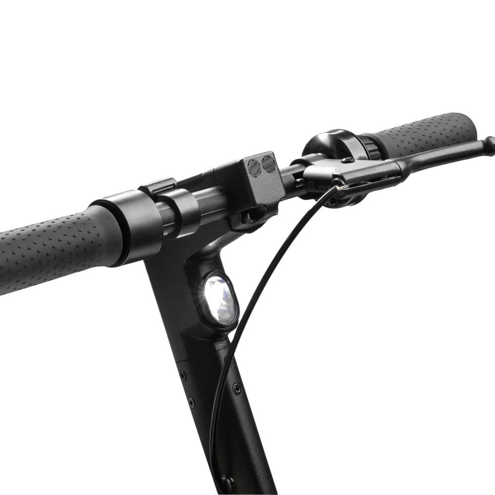 Широкая нескользящая платформа с логотипом компании, мало стираемые устойчивые колеса, удобные, повторяющие анатомические части тела грипсы и подножка обещают безопасную езду и своевременную остановку. Тормозная часть электросамоката удобная и практичная. Торможение проводится с помощью барабанной системы и рекуперативного тормоза.