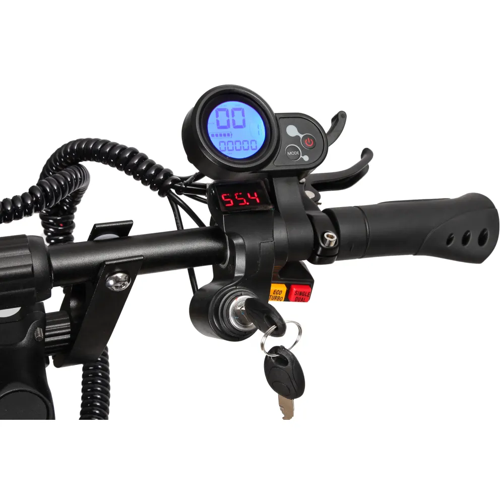 Повышенная проходимость агрегата порадует любителей загородных поездок. Он преодолевает подъемы в 45 градусов, подъемистый и резвый. Быстро набирает скорость, максимальные показатели которой составляют 60 км/ч. Полный привод способствует маневренности электросамоката. При спокойном передвижении можно отключить одно мотор-колесо.