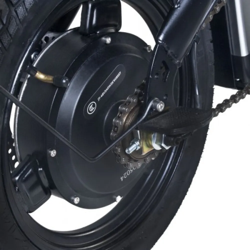 Мощность электромотора 350 Вт и емкости батареи – 12 А*ч достаточно для развития приличной скорости – до 45 км/час и преодоления расстояния до 42 км пути. Байк оснащен механическими тормозами и 14-дюймовыми накатистыми колесами. Батарея размещена за подседельной частью в специальном блоке. Надежно спрятана от негативных воздействия погодных факторов.