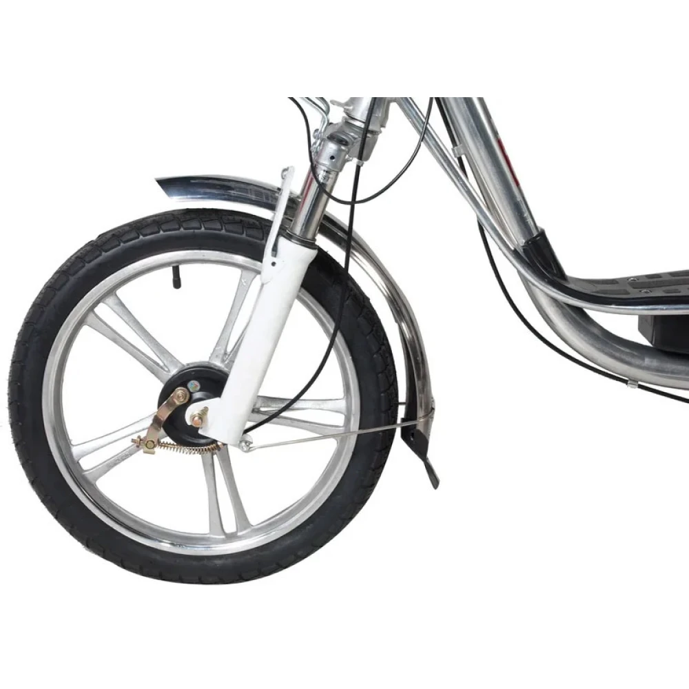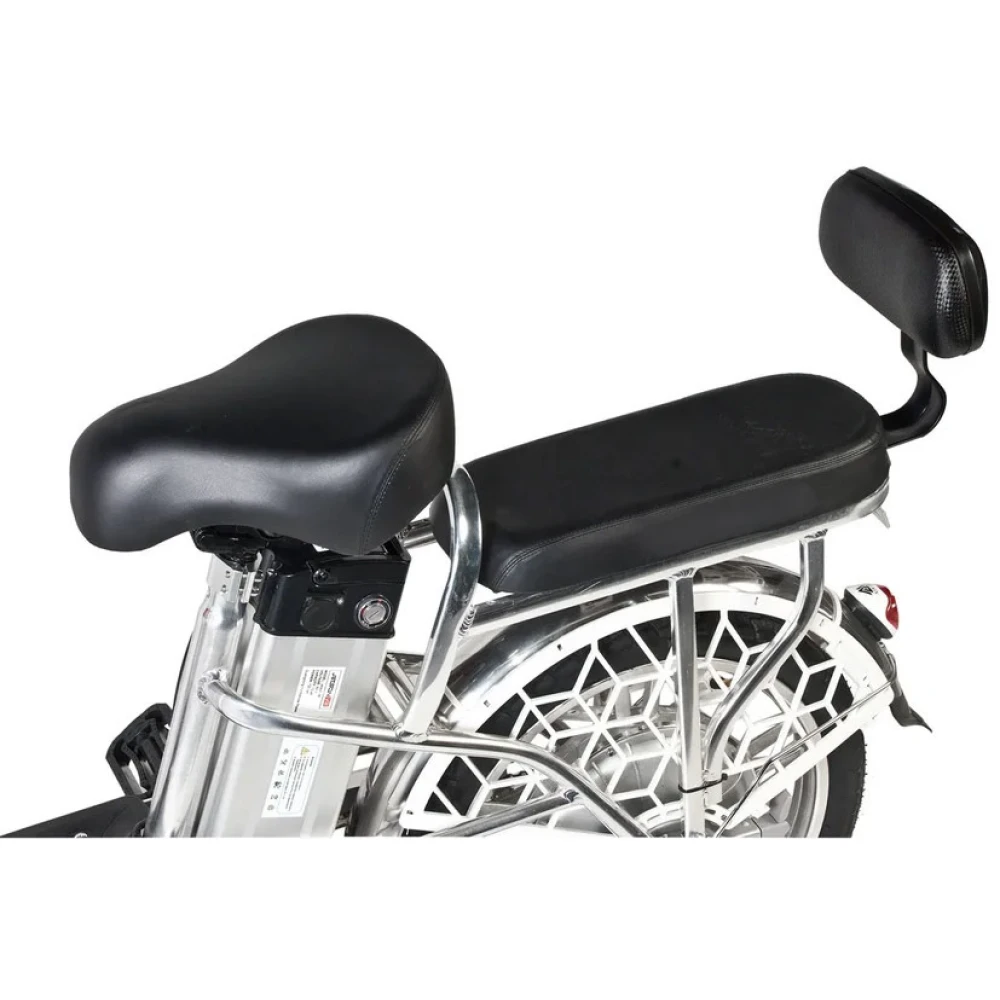 Электровелосипед оснащен большими устойчивыми колесами, мягким сиденьем для водителя и пассажира. Второе имеет удобную спинку, снижающую нагрузку с позвоночника. Техника оснащена всем необходимым для активного время провождения, поездки в магазин