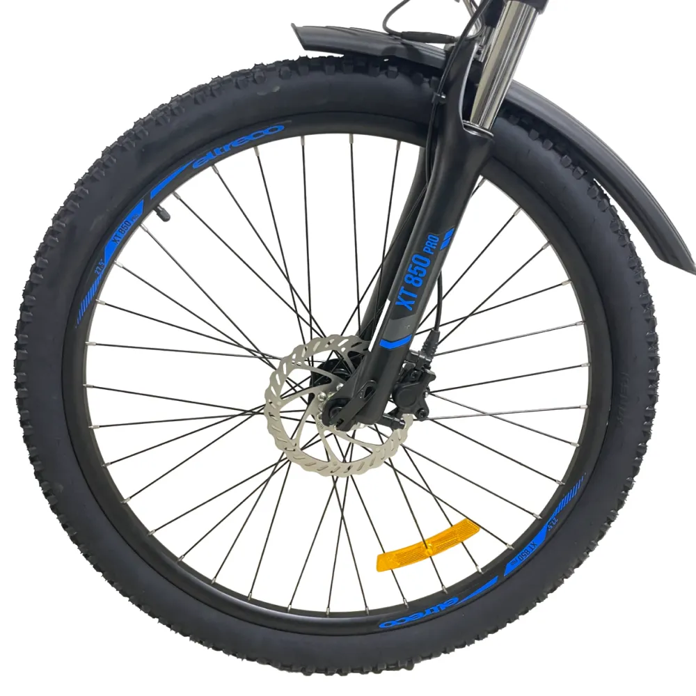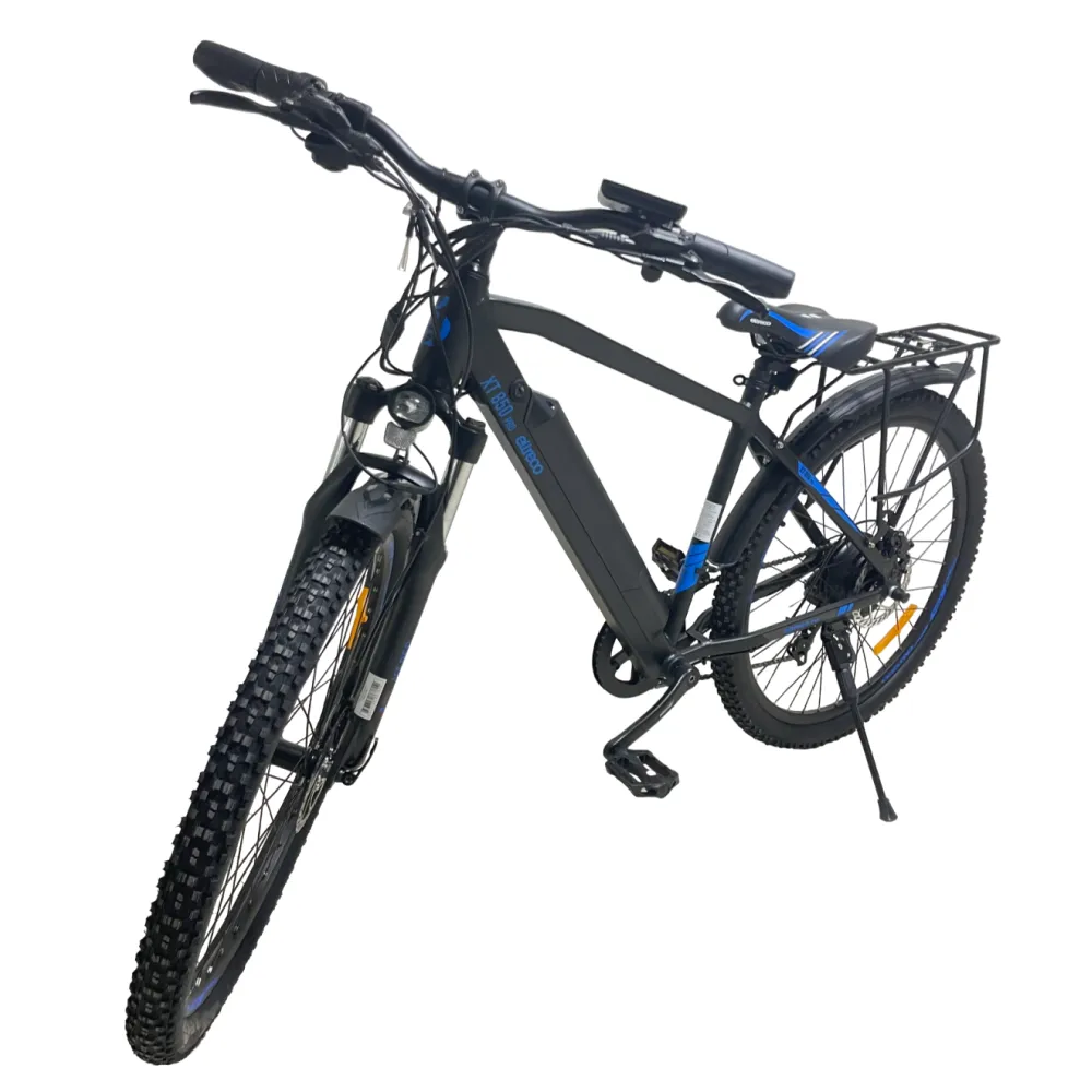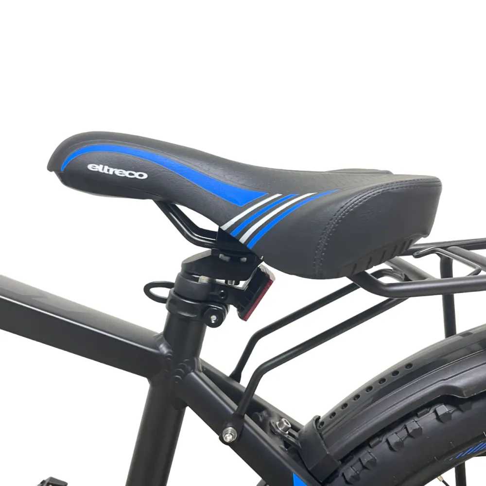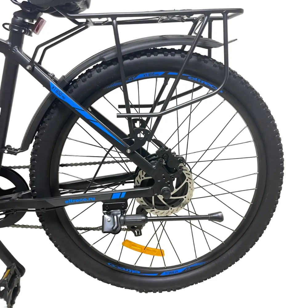 Электровелосипед Eltreco XT 850 pro имеет стильный черно-синий дизайн, который придает ему элегантный и современный вид. Он идеально подходит для городских поездок или для прогулок на природе.