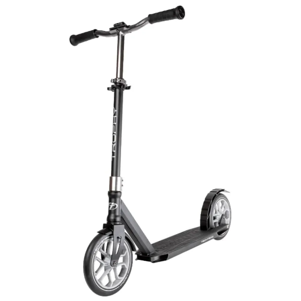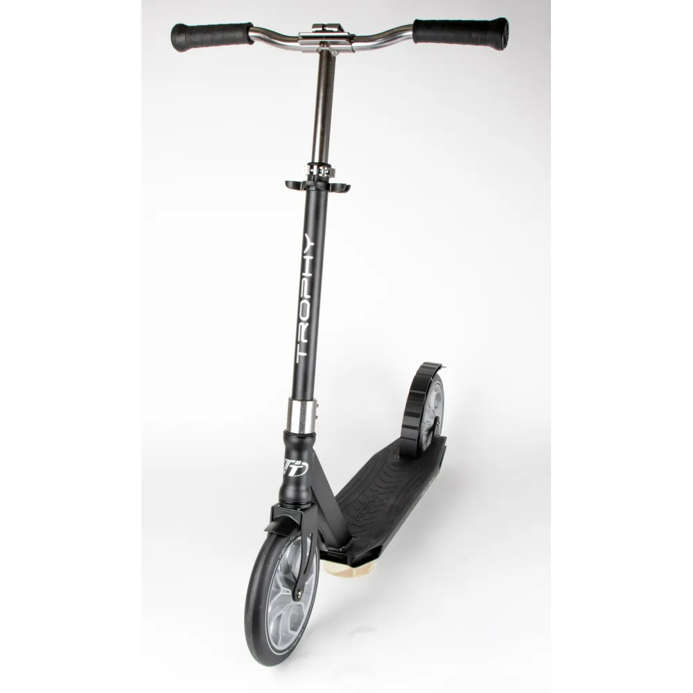 Черно-серый САМОКАТ TROPHY COMPLETE – лучший подарок на мероприятие разного рода. Хит продаж сезона 2021. Завоевал признание пользователей отличными скоростными характеристиками, простотой управления и качественностью технической части.