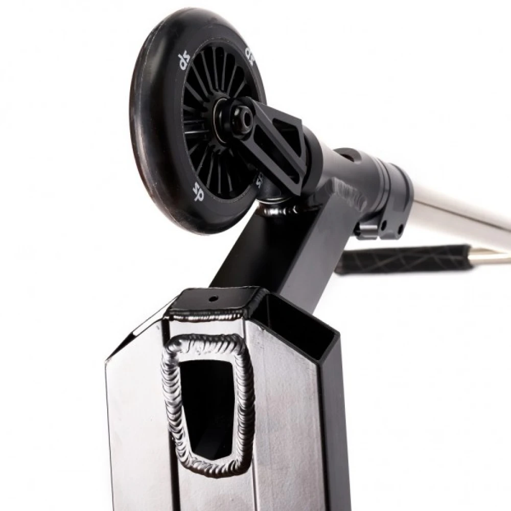 Модель оборудована 110-мм полиуретановыми накатистыми колесами с инновационными подшипниками. Высота руля – максимальная, может быть заточена под высокого трюкача и невысокого пользователя. Небольшой вес техники позволяет выполнять опасные трюки, в том числе и амплитудные.