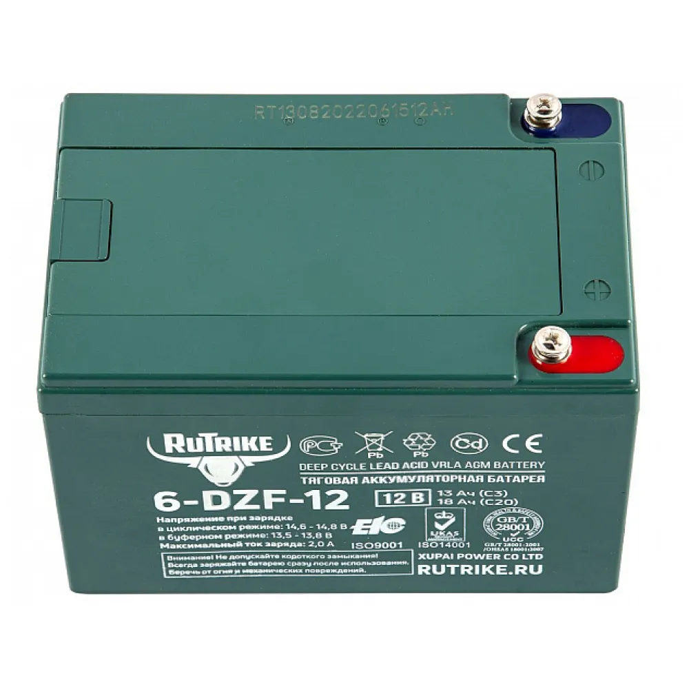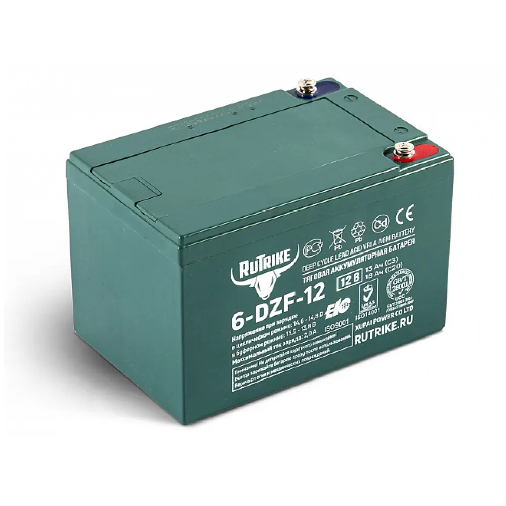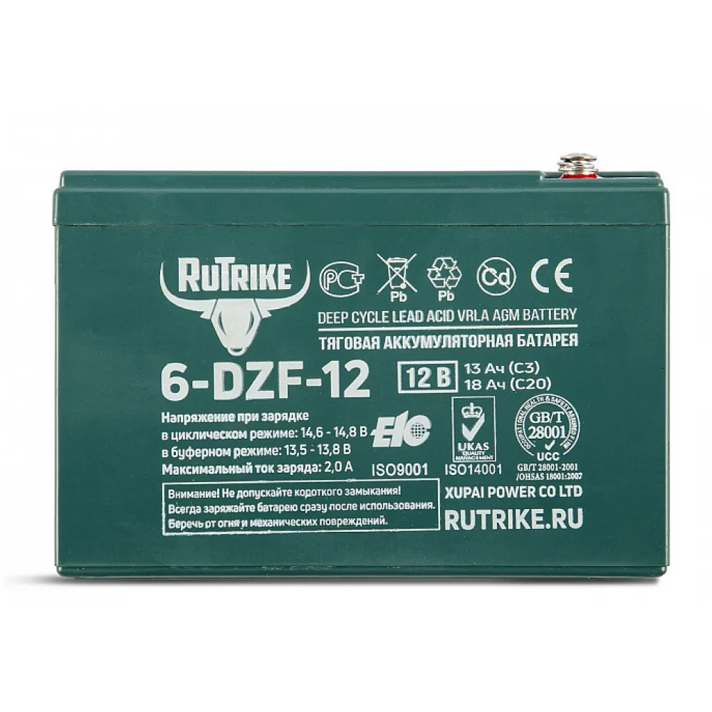 Тяговый свинцово-кислотный аккумулятор RuTrike 6-DZF-12 (12V13Ah C3) – батарея со сгущенным элетролитом гелеобразной консистенции. Предназначена для зарядки электро: самокатов, трициклов, тележек, велогибридов, инвалидных колясок, мотоциклов и инструментов. Не обслуживается. Срок службы – 700 циклов при условии подзарядки на 80%.