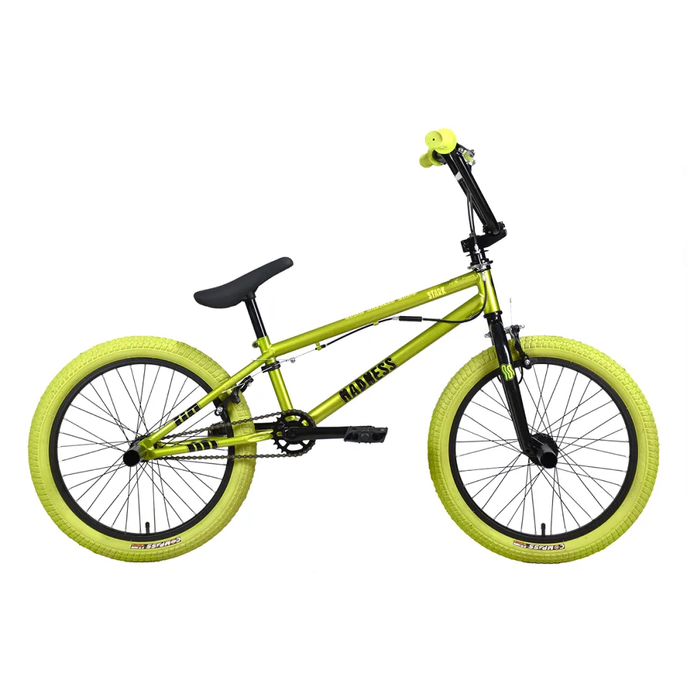 BMX велосипед Stark Madness 3 2024 года выделяется своим оригинальным зеленым металлик цветом рамы и зелеными хаки покрышками. Стальная рама Hi-Ten 13A весом 14,3 кг и размером 9 дюймов совмещает в себе прочность и легкость. Ободные клещевые тормоза Sparkle U-969D и жесткая вилка Stark Rigid обеспечивают безопасность и уверенность на трассе, а 20-дюймовые колеса подчеркивают экстремальный стиль. Резиновые грипсы XHH XHG117 и стальной руль Intek ITC-6665 гарантируют комфорт при каждой поездке. Седло Aerj A-6609 и цепь KMC Z-410 обеспечивают надежность в использовании. Втулки Kung Teng AJ9R/KT135F подчеркивают эстетику этого BMX велосипеда, делая его незаменимым для любителей экстремального катания.